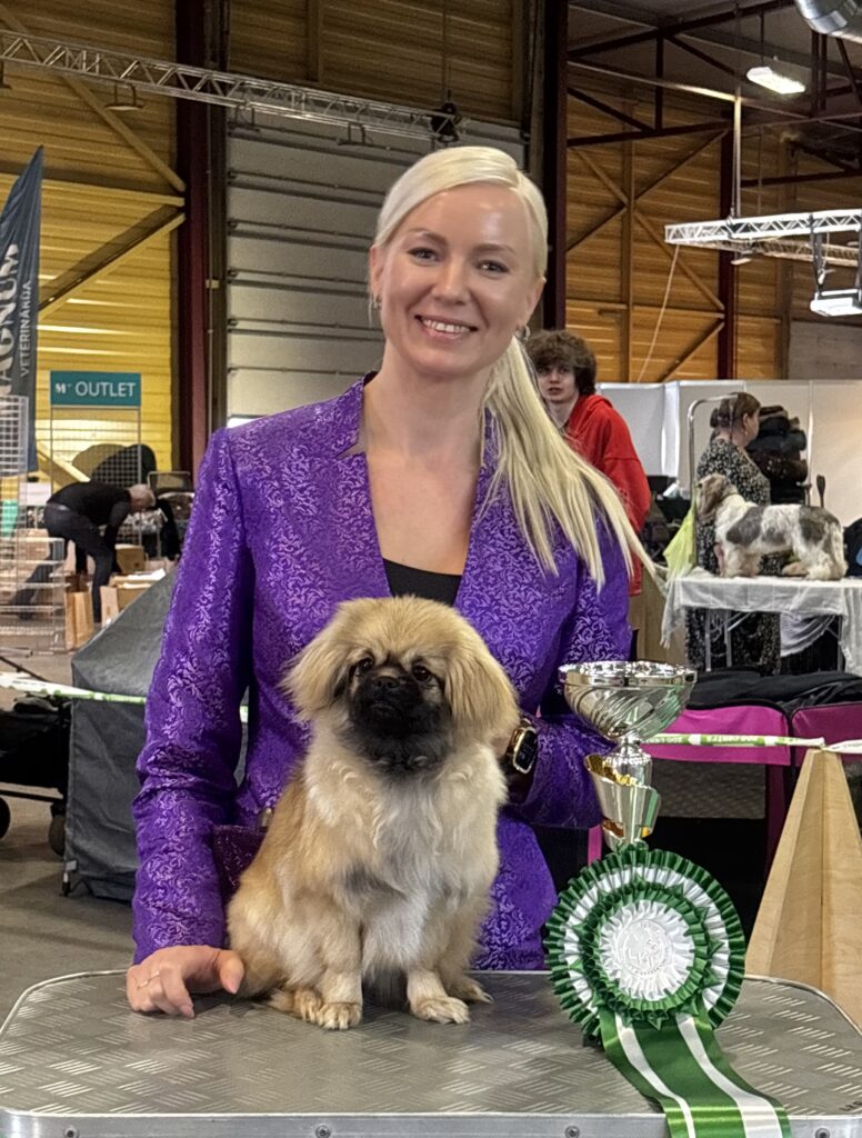 Ihana Dolly – neitimme aloitti näyttelyuransa Latviassa, Rigan kv näyttelyssä 7kk ikäisenä, pentuluokissa tottakai! Liisa on treenannut Dollyn kanssa muutaman kerran kehäjuttuja ja upeastihan se Dolly esiintyikin hänen taitavissa käsissään molempina päivinä.