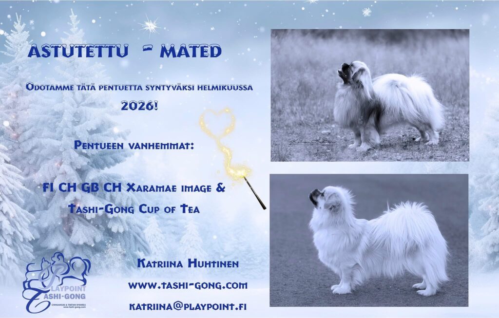 Tätä pentuetta odotetaan syntyväksi helmikuussa 2026 ja pennut ovat luovutuksessa huhtikuussa 2026. ”Soma” on ultrattu kantavaksi! Mahdollinen narttupentu sijoitetaan Kuopion alueelle tai aktiiviseen kotiin muuallekin Suomeen. Narttupennut on varattu, mutta mahdollisiin poikapentuhin otamme vielä alustavia varauksia.